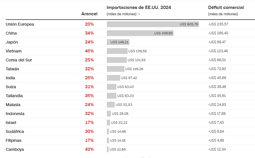 Trump ha anunciado un arancel del 10% a las importaciones desde cualquier país y aranceles aún más altos para los siguientes socios comerciales que tienen un alto déficit comercial con Estados Unidos.